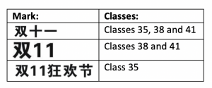 Alibaba applied for a series of trademarks regarding ‘Double 11’ from November 2011. Applications included Class 35 for advertising, Class 38 for communications through radio or television programmes and Class 41 for entertainment services. The applications were approved in 2012 and 2013, including the following: