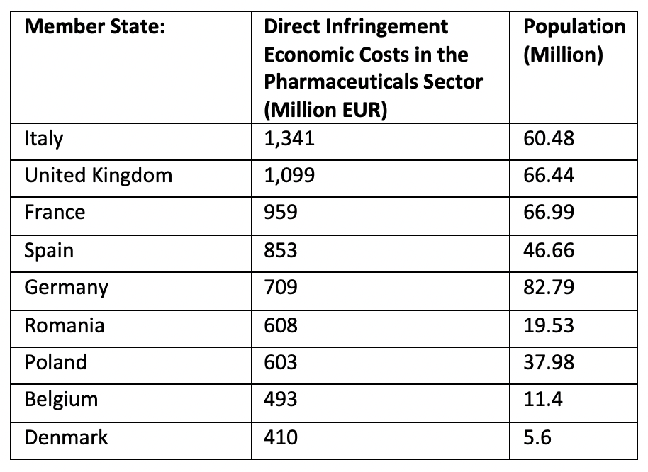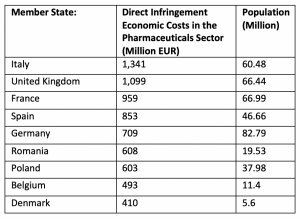 In terms of monetary value, the pharmaceutical sector experienced the highest losses, amounting to €410 million. While this represents only 3.4% of the total turnover, this amount puts Denmark in the top 10 of the EU 28 for direct infringement economic costs in the pharmaceuticals sector.